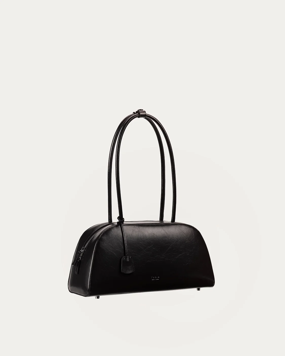 Its sculptural silhouette, seamless body, and elongated rolled handles feel both familiar and fresh. A leather tassel adds soft movement, while protective metal feet and a smooth zipper open to a spacious, everyday-ready interior.